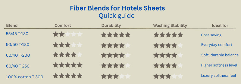 Choosing the right fiber blend matters for both guest comfort and linen performance. Hotel sheets must stay soft, resist repeated high-temperature washes, and keep a clean, crisp look. Here is a simple guide to the most common blends used in hospitality.