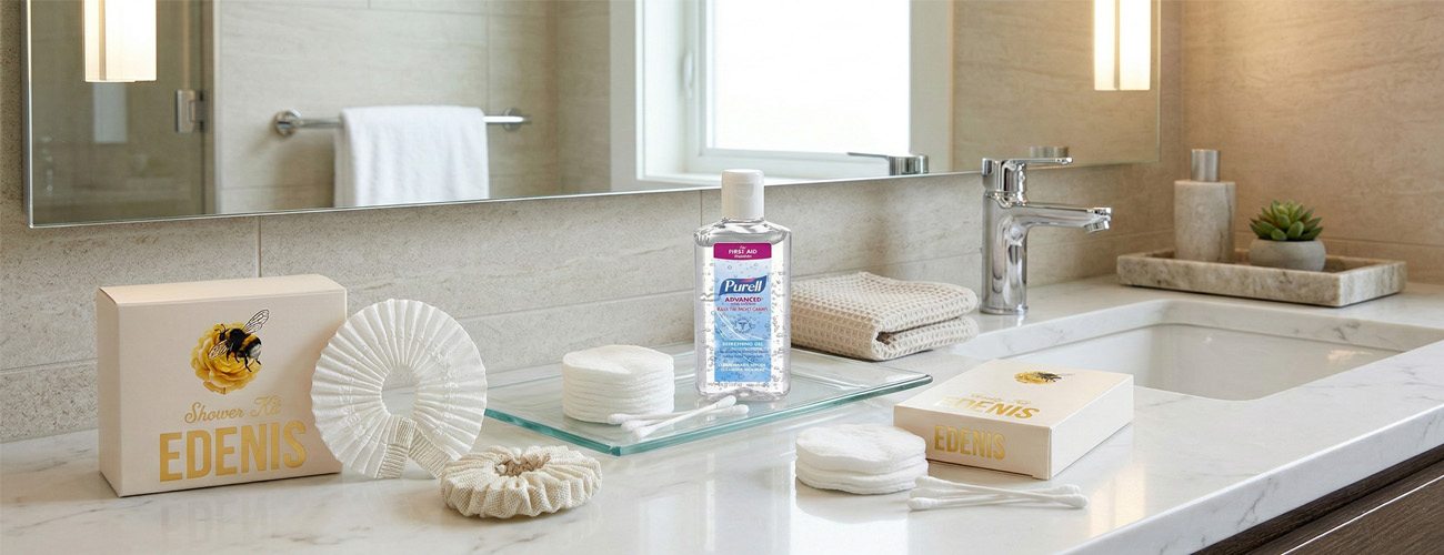 The selection includes shower caps, vanity kits, and personal care accessories designed for hotels, boutique properties, and short-term rentals.