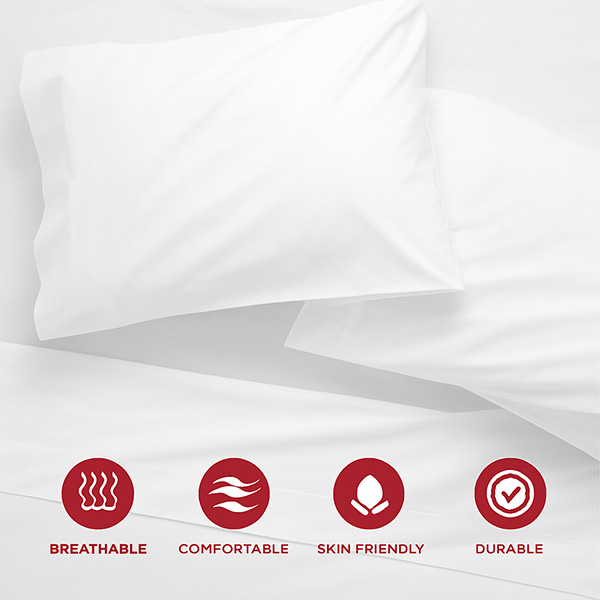 Made with 55% cotton and 45% polyester, it offers long-lasting comfort. The classic percale weave ensures a smooth feel, while the crease-resistant finish keeps it looking fresh and crisp. With heat-set finishing for shrinkage control and reinforced stitching, it’s built for frequent laundering. Ideal for economy hotels seeking reliable, high-quality bedding. Available in Standard, Queen, and King sizes.