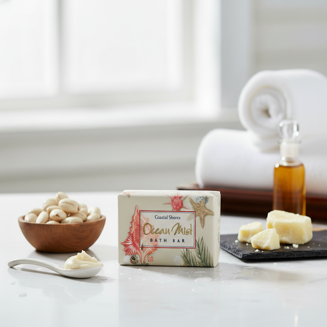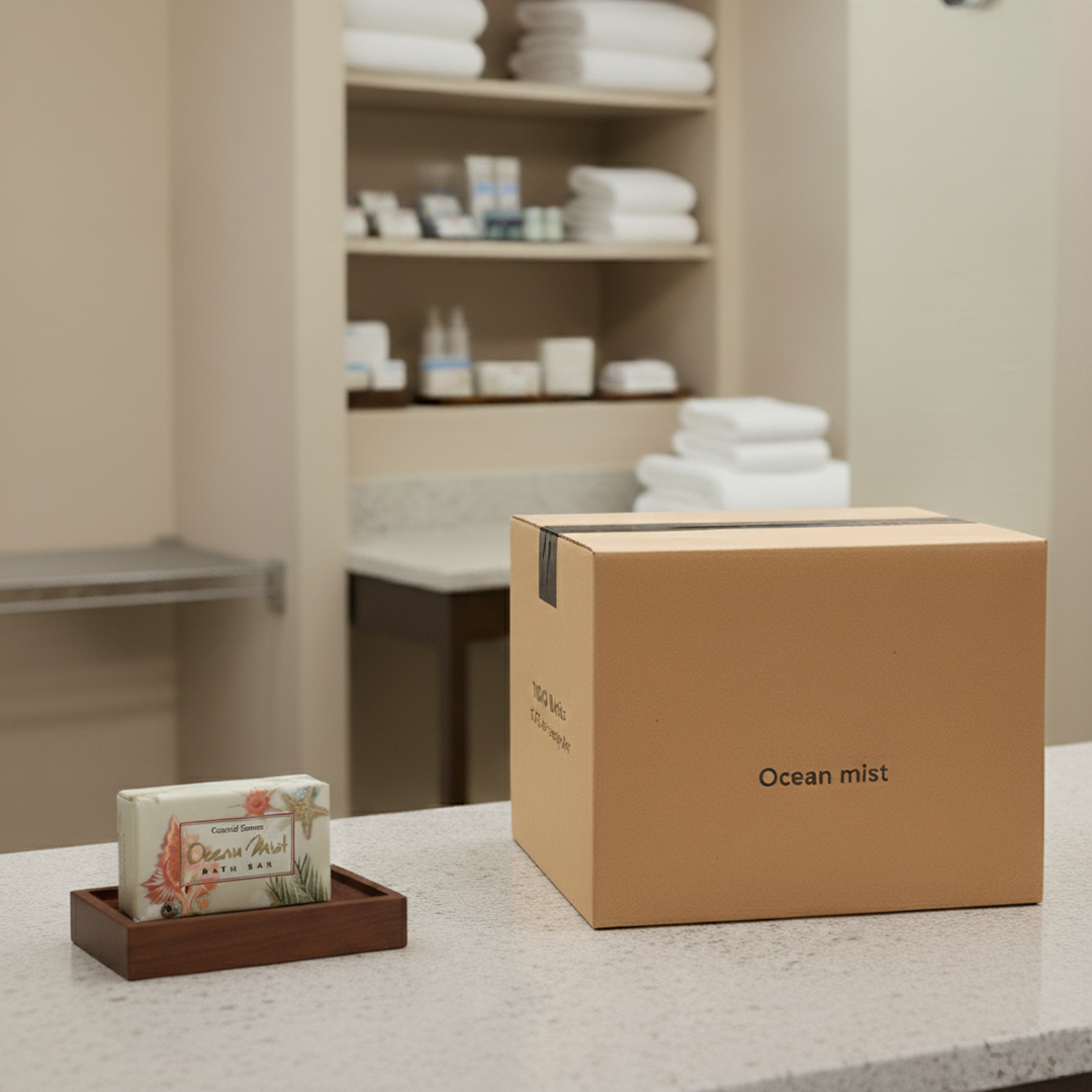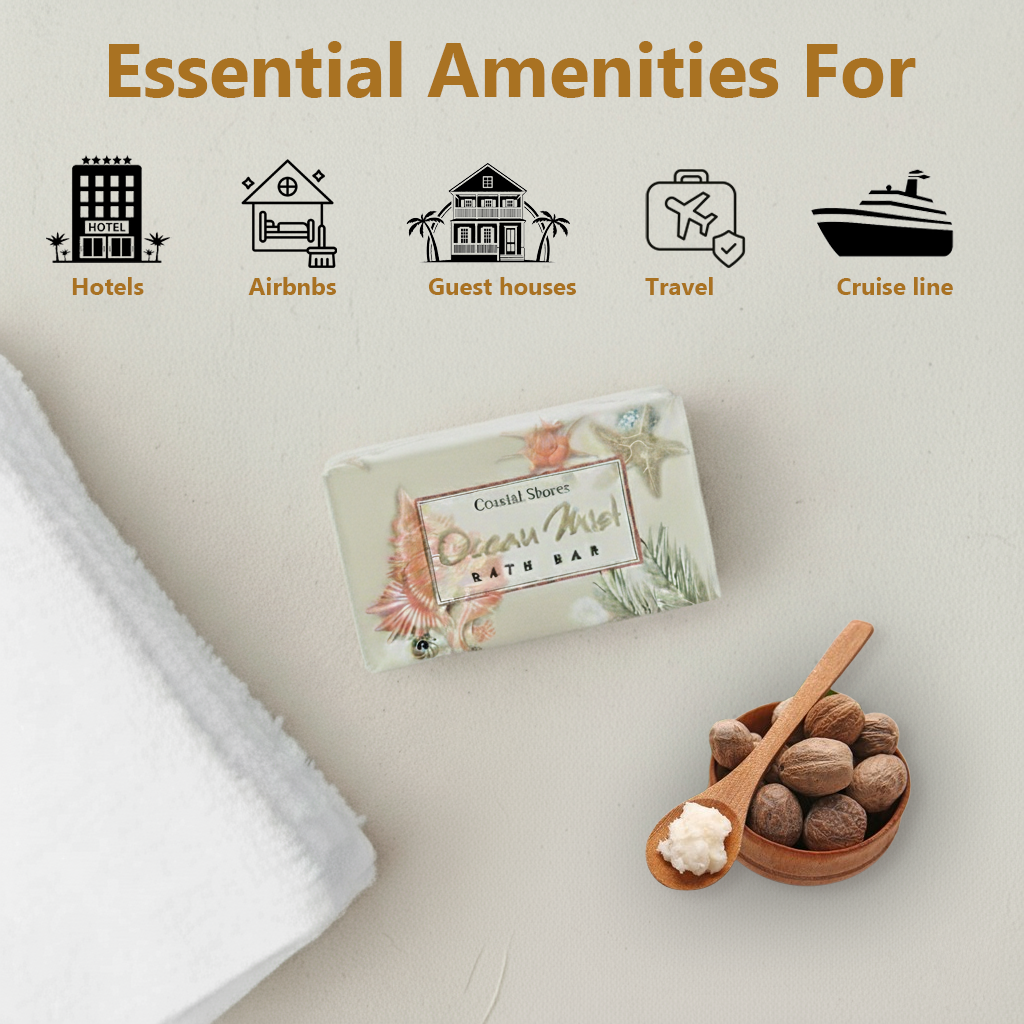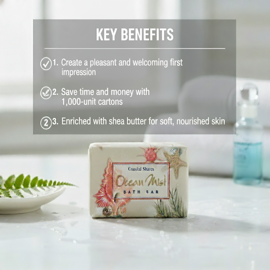 The Ocean Mist Soap Bar, a 0.75 Oz amenity soap is specially crafted for hotels, motels, and other hospitality settings. Enriched with shea butter and sea kelp powder, this individually wrapped bar offers a refreshing ocean mist scent while gently cleansing and moisturizing the skin.