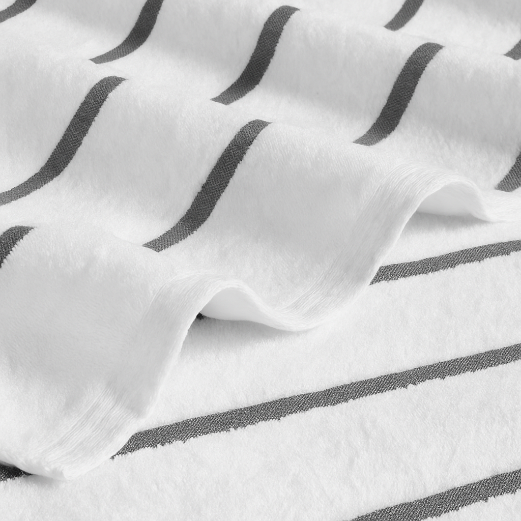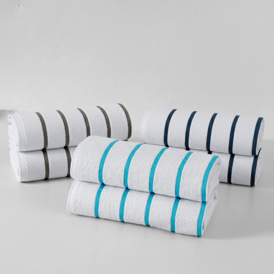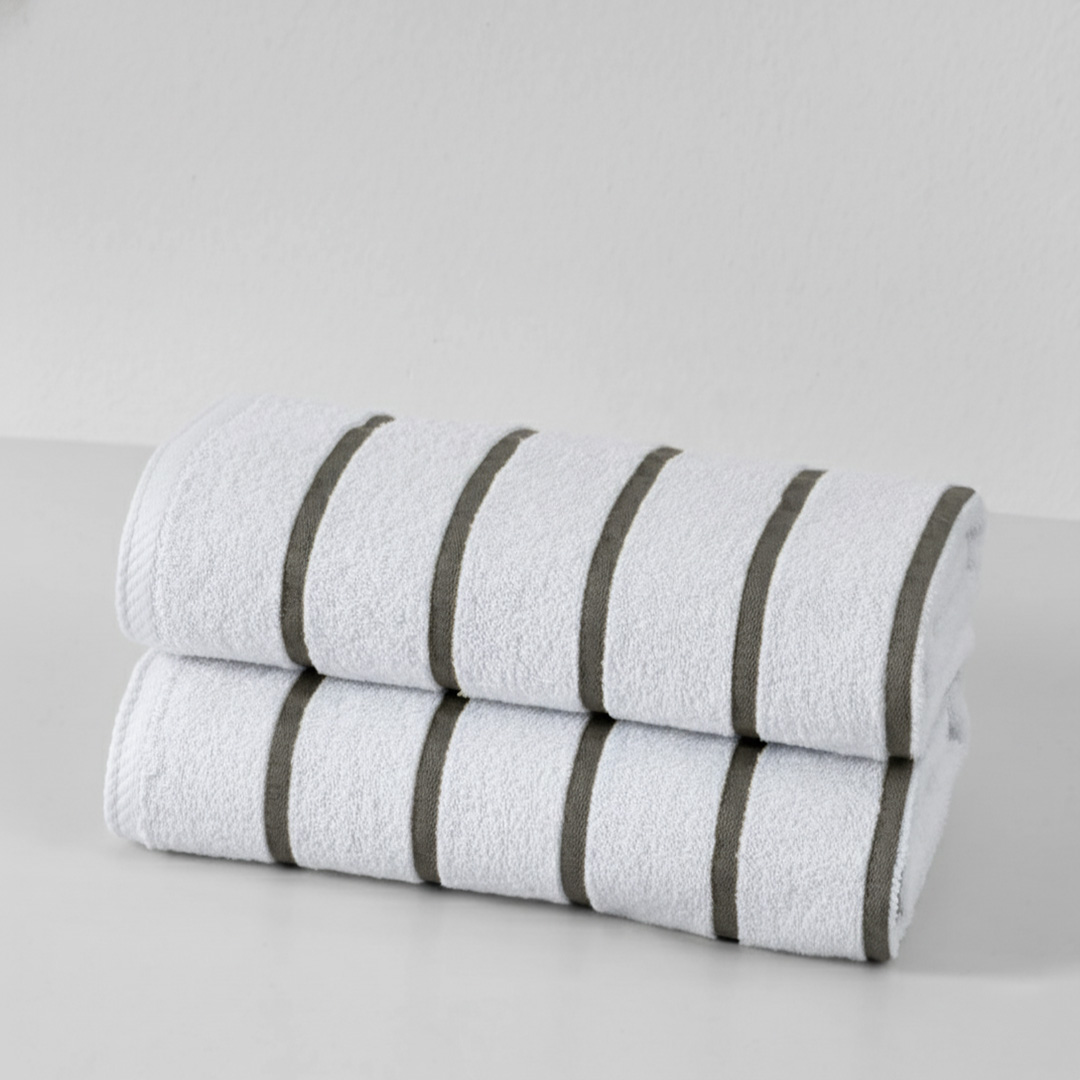 The Oxford white pool towel with charcoal grey stripes, 30″x60″, brings timeless style and reliability to any hospitality setting.