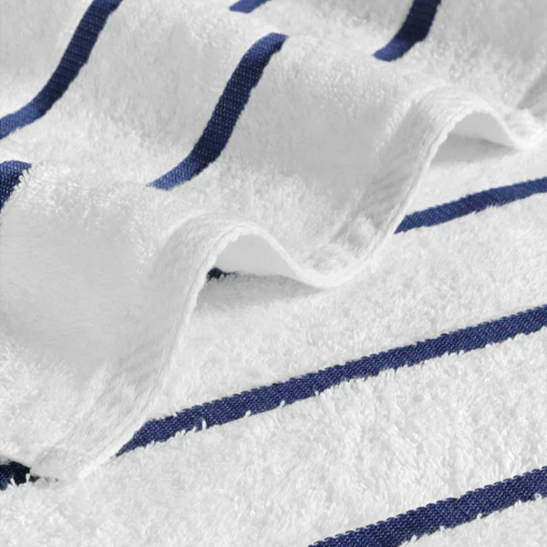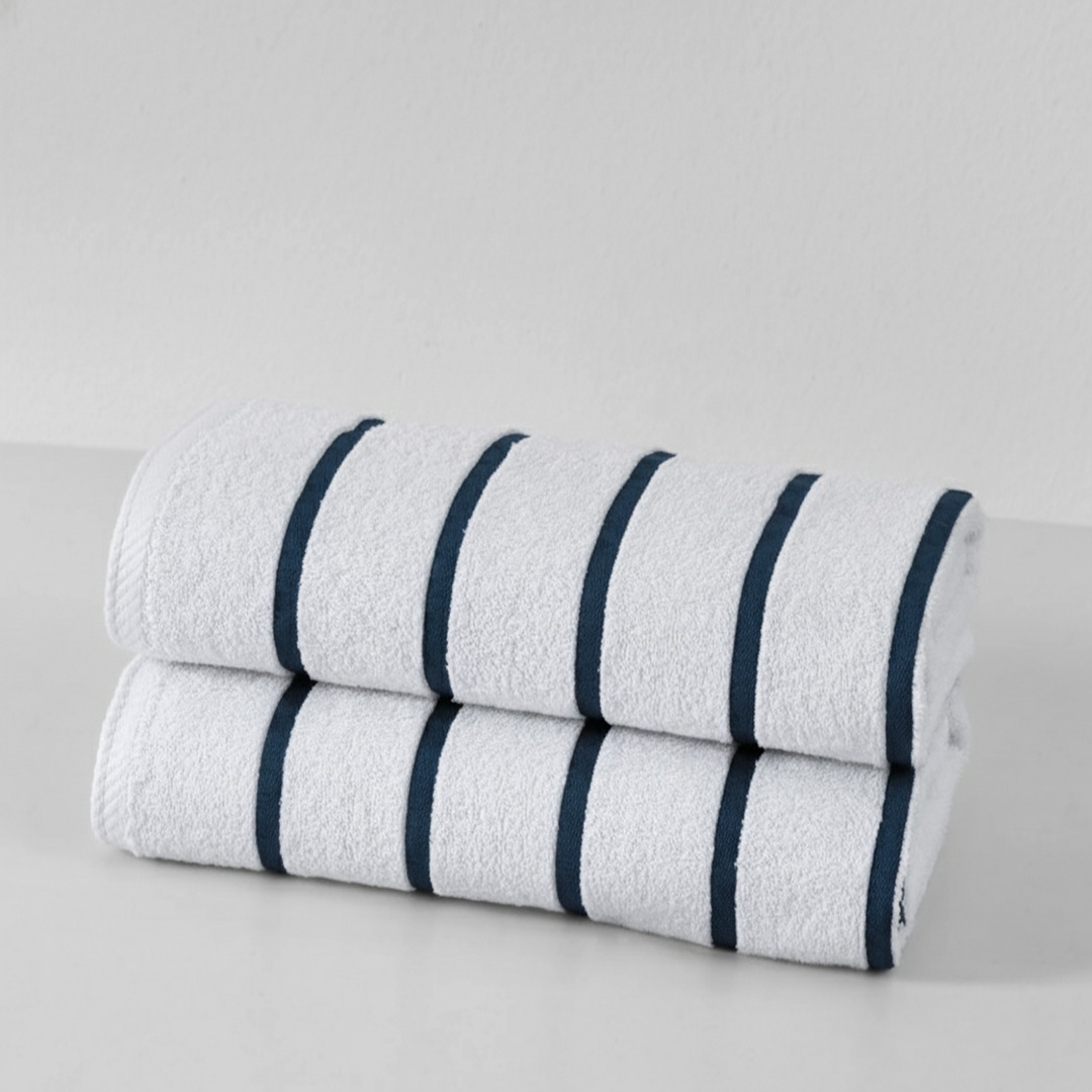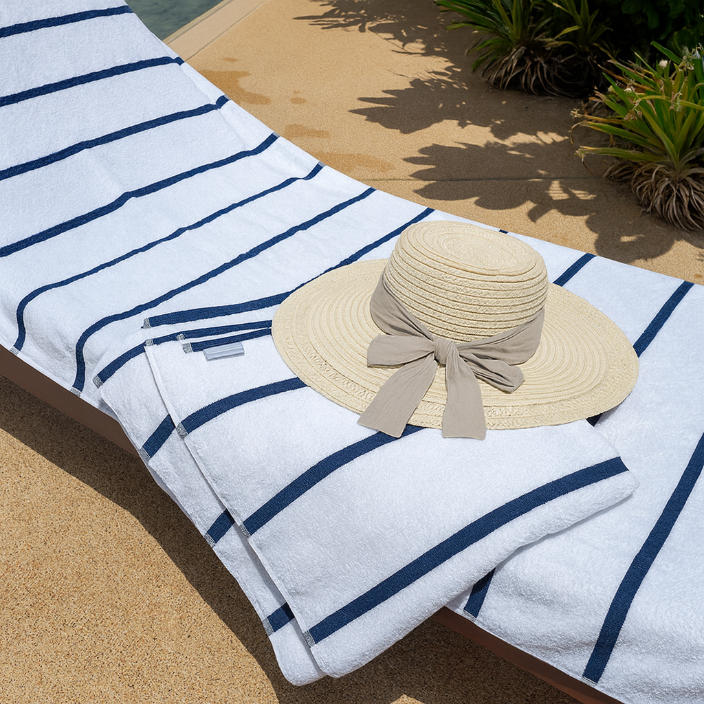 Discover the Oxford white pool towel with navy stripes, 30″x60″, designed for comfort and style by the pool or beach.