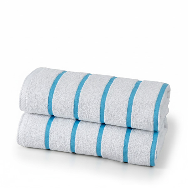 Brighten up any pool or beach space with the Oxford white pool towel featuring turquoise blue stripes, 30″x60″.