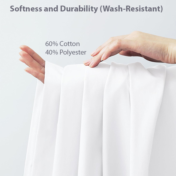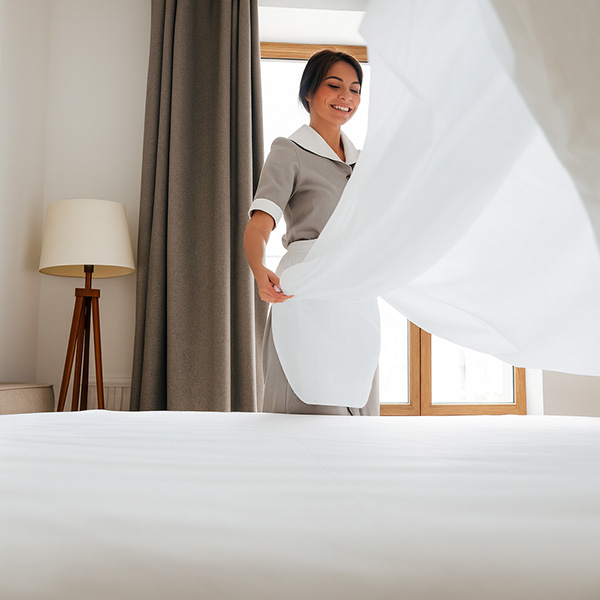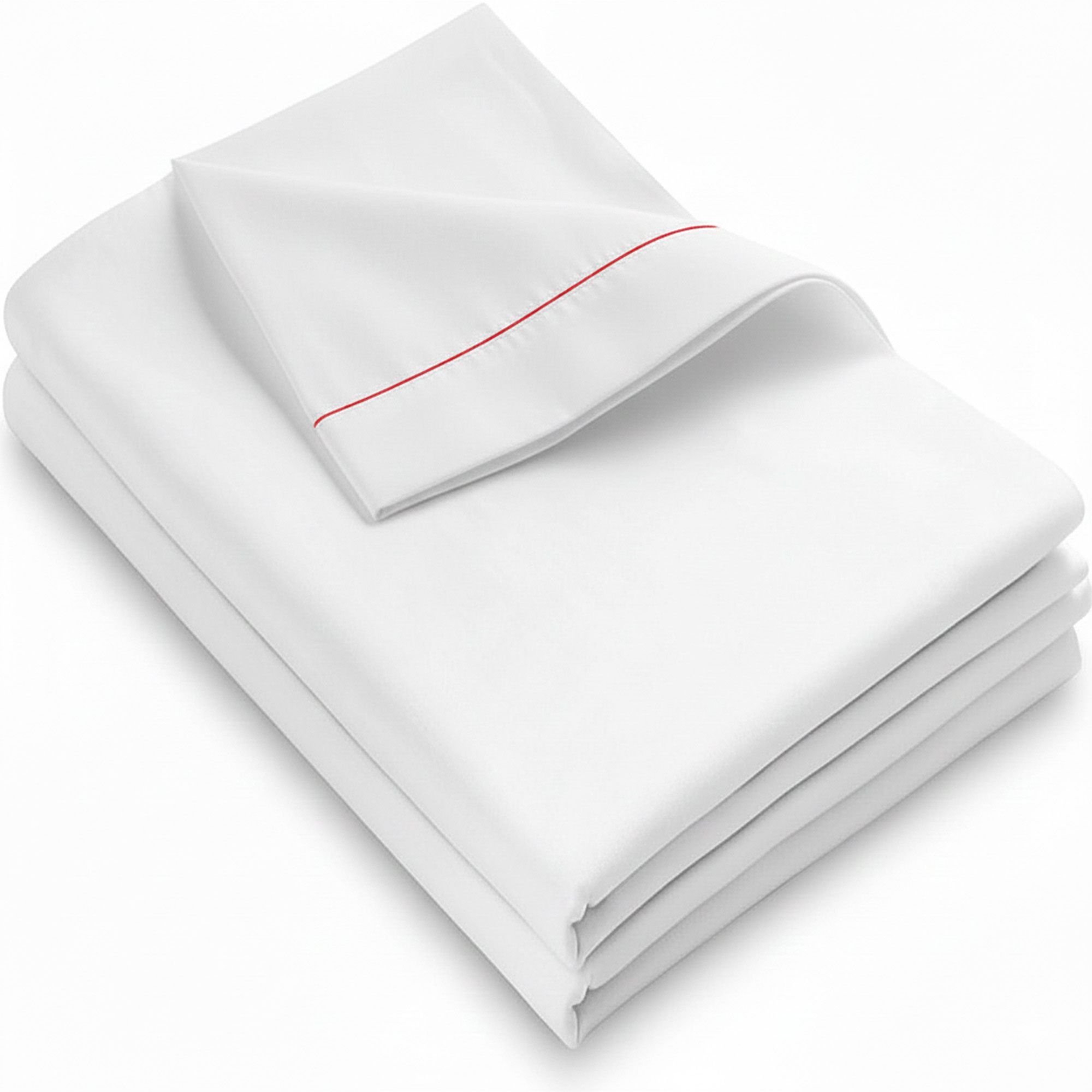 The Thomaston Mills T-200 flat sheet delivers crisp, cotton-rich T-200 percale. Red threads at the hem let staff confirm size at a glance.